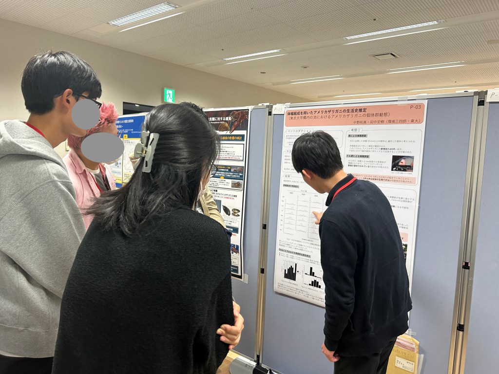 第62回 日本甲殻類学会に参加してきました! 投稿者:k3462024年12月29日2024年12月29日カテゴリー:活動報告タグ:池プロジェクト 2024/11/30-12/01に函館で行われた第62回 日本甲殻類学会に参加してきました!ポスター発表を行い、厳しくも優しく参加者の方からいろいろな意見をいただくことができました。他の方の発表も参考になる手法や視点が多く、参加して非常によかったと思います。今後のアメリカザリガニ調査にも活かしていこうと思います!(函館は雪が降っていました。普段東京に住んでいる身としては、吹雪のようなものでした…) 関連