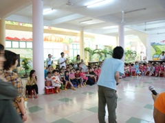 パワフルで、才能あふれるベトナムの若者たち。![]() 専門家の方々に3Rプロジェクトの概要を伺う 最初に訪問したのは、ハノイ市を中心に行われている3Rプロジェクトです。ベトナムでは人々の環境意識がまだまだ低く、ごみの分別が出来ていないこと。集められたごみを適切に処理する仕組みも不十分であること。そのため3Rプロジェクトでは、テレビCMを利用したキャンペーンから、生ごみ堆肥化のプラント建設まで、幅広い活動を行っていること等について説明を受けました。 その後、私たちはこのプロジェクトに協力しているベトナムの学生たちと交流する機会に恵まれました。自分達と同年代でありながら、流暢な英語を操り、自信と誇りに満ちた表情で活動を紹介するベトナムの若者たち。別れを惜しむ僕らと対照的に、これから英語のレッスンに行くから!と、手を振った彼女たちの笑顔はとても輝いて見えました。 ハノイの至る所でポイ捨てがされている様子を見ると、まだまだ「循環型社会」への道のりは長いようにも思われますが、英語の上手なベトナムの若者たちが大活躍する日が、早く来て欲しいと強く感じました。 楽しませることから楽しむことへ 〜青年海外協力隊訪問〜![]() Ninh Son小学校。シャイな子どもも「ハイタッチ」をすれば自然と笑顔に 続いて、小学校や幼稚園、障害児施設で活動する青年海外協力隊の方々を訪ねました。学校によって規模や設備は異なるものの、新しい遊びをするのが大好きなのはどこの子どもも一緒。日本の歌や遊びを紹介する授業の用意もしていたのですが、気が付けば最後には全校生徒が集まってきて大騒ぎ…。「こんなに生き生きとした子ども達を見たのは久しぶり!」と言って頂いたのは本当に嬉しかったです。授業前の緊張感もどこへやら。肩肘張らずに自分達も楽しむことが、子ども達との距離を縮める一番の方法だと気付かされました。短い時間ではありましたが、こうして「外国人と遊んだ」思い出が、一人でも多くのベトナムの子ども達の心に残って欲しいものです。 暗記中心のカリキュラムが依然根強く、間違うことを「悪いこと」とする風潮の残るベトナム教育界にいて、子ども達の日々の成長を優しく見守る協力隊の方々の姿は、とても輝いて見えました。 おわりに 〜国際協力の現場を訪ねて〜![]() 10月20日幼稚園では全園児による大歓迎。こんなに大勢の前で話すのはやはり緊張します…。 これまで私たちは、「技術移転」を単純なモノの移動のように考えてきました。しかし今回こうして協力隊の方々を訪れた事で、そこには異なる文化の接触に伴う非常に人間臭いドラマが存在することに気付かされました。環境・教育・医療それぞれの分野で、日本が培ってきた技術や精神を紹介しようと日々泣き笑う日本人がいて、それらの取捨選択に悩むベトナムの人々がいることに気付かされました。世界中で活躍するJICAボランティアの姿が、さらに多くの人たちへと伝えられる事を望みます。 そして今回のツアーが、今も世界の人々のために活躍されている日本人の存在を思い出して、今回ツアーに参加してくれたメンバーの一人でも多くが、「今度は自分が」と何かに本気でチャレンジするきっかけになってくれたのなら、企画者としてこの上ない幸せです。 |